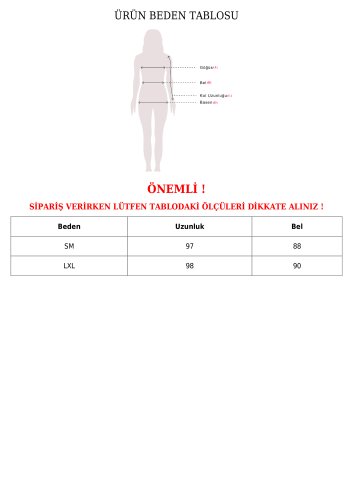 • Modelin Ölçüleri: Boy:165, Kilo:55, Göğüs:90, Bel:72, Kalça: 100