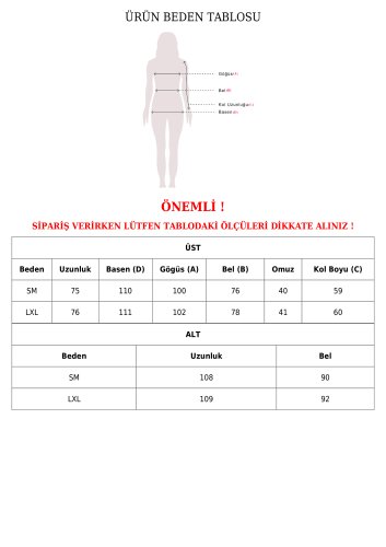 • Modelin Ölçüleri: Boy:165, Kilo:55, Göğüs:90, Bel:72, Kalça: 100